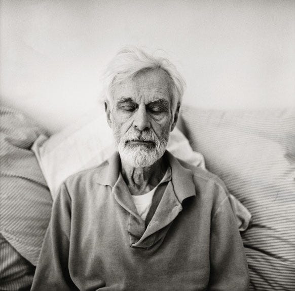 I think most people have at least one artwork to which their mind returns unbidden, drawn back by some element in the work, something that seems at once to invite and resist understanding. I often think of this black-and-white portrait of the poet and critic Edwin Denby, taken by Peter Hujar in 1975. It shows Denby, then 72, sitting on a divan or bed, wearing a casual shirt. His eyes are closed, his mouth a line: I want to say that he’s expressionless, but that’s impossible, and I know I should try again. One purpose of Hujar’s picture, and the way Denby appears within it, is to invite you to say that Denby feels a certain way, that what’s settling or stilling here may have been fatigue, or stress, some agitation caused by the world beyond the frame. If you know nothing of Denby, you might see an ageing man, and imagine fatigue, or world-weariness; but then you might learn a little of Denby, such as the fact that he suffered from depression, and would kill himself eight years after Hujar took his photo, and you might look again at the picture, and see weariness become pain. And then again, you might learn a little of Hujar, who liked to quietly glamorise, to sleeken, the emotions of his subjects, so that the line between real and fake, as we treat them in the everyday, soon becomes hard to divine. Denby’s face, in the richest sense, is an inconvenient fact.